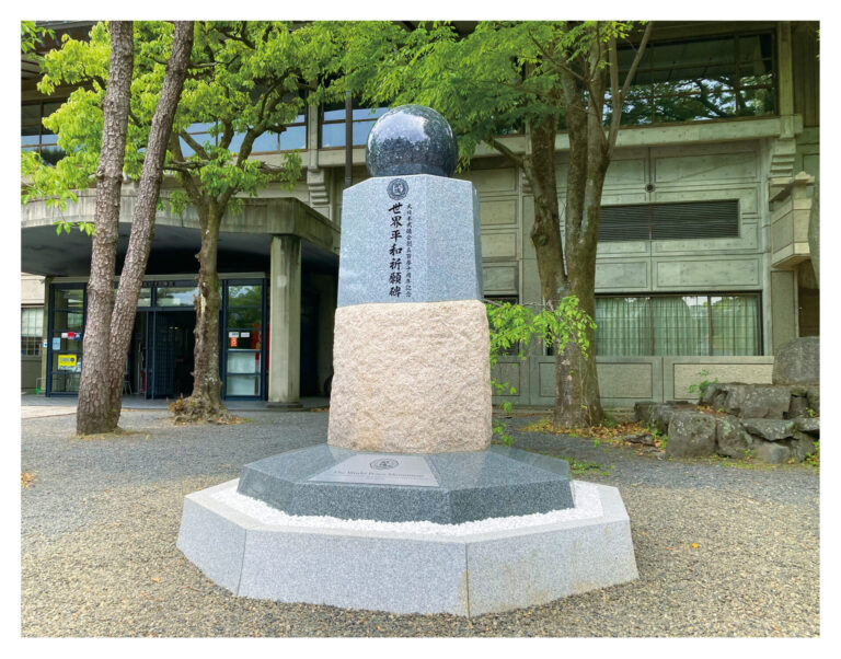 上部の球体は地球を表現、地球を支える8角形の台座は色味や仕上げの違う世界の御影石が使用されており、人の和を表しています。世界中の人々がお互い手を取りあい、尊重し合い世界が平和になるようにとの思いが込められています。