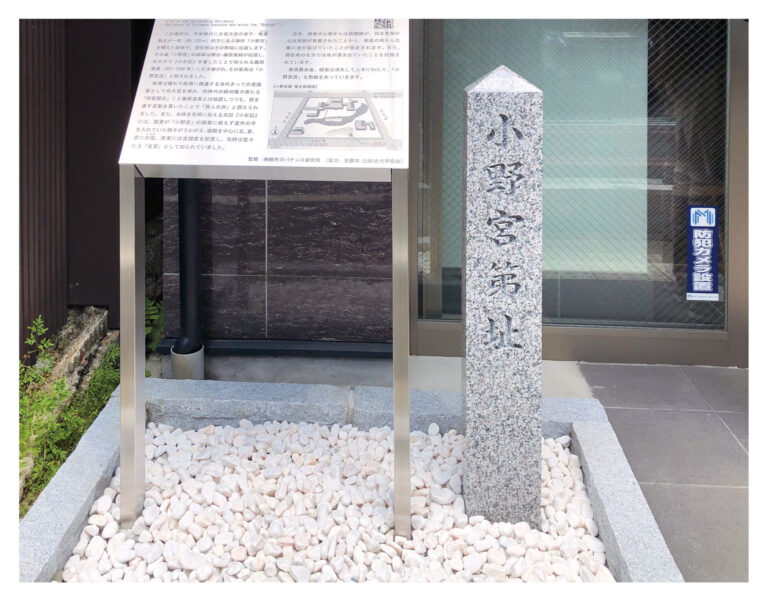 小野宮第址は、平安時代に文徳天皇の皇子である惟喬親王の邸宅だった場所です。後に日記 『小右記』の著者として知られる藤原実資が「小野宮」に居住し、右大臣を務めていたことから、「小野宮右府」とも称されました。